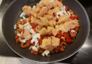 - Ajouter dans une poêle à feu vif avec un fond d'huile les blancs de poulet, les poivrons et les oignons en ajoutant du sel et du poivre pendant au moins 20 min jusqu'à ce que le poulet soit coloré