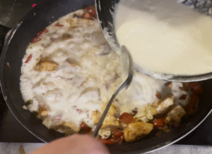 - À la fin de la cuisson du poulet, couper le feu et ajouter la moitié de la sauce de la casserole et 125g de fromage râpé en mélangeant bien la préparation