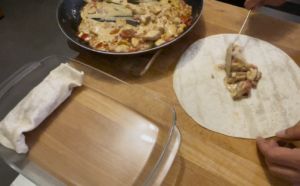 - Sur un plan de travail, prendre une feuille de tortilla et ajouter 1/8 de la préparation de la poêle au centre puis la refermer en rabattant les bords puis en la roulant pour l'ajouter dans un plat à gratin
