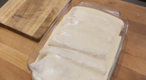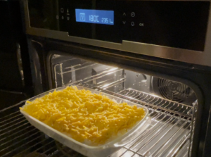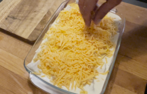 - Une fois le plat rempli, ajouter le reste de sauce de la casserole sur le dessus en la répartissant bien